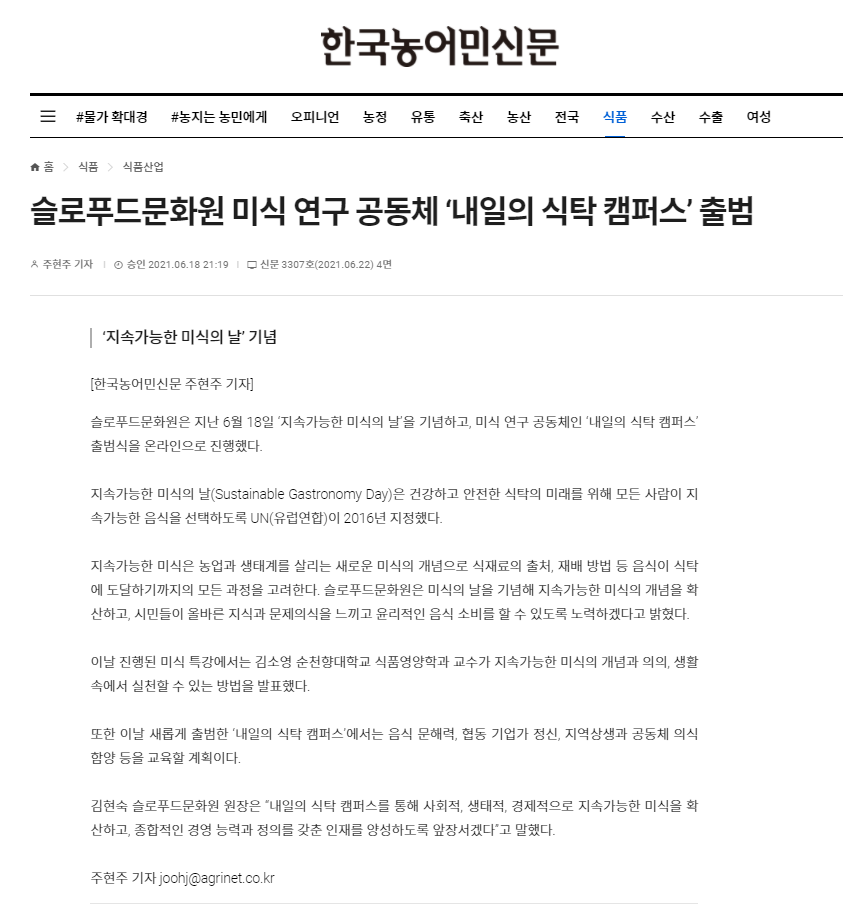 [한국농어민신문] 슬로푸드문화원 미식 연구 공동체 ‘내일의 식탁 캠퍼스’ 출범