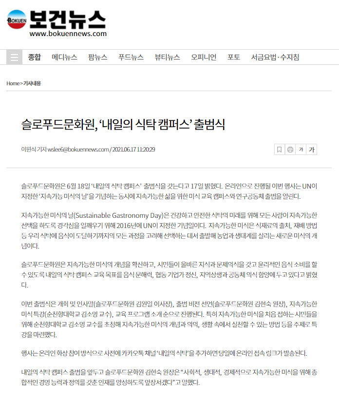 [보건뉴스] 슬로푸드문화원, ‘내일의 식탁 캠퍼스’ 출범식
